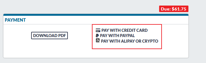 点击CLICK TO PAY ONLINE付款,支持信用卡、PayPal、支付宝、加密货币(支付宝按钮),这里会额为收取3%的网关支付费用。