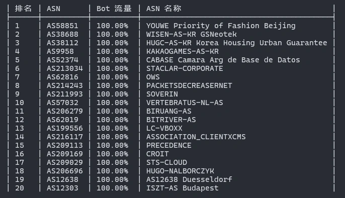 比如上面这些 ASN. 在之后我会单独提供一个现成的高 Bot 流量占比的 ASN 列表.