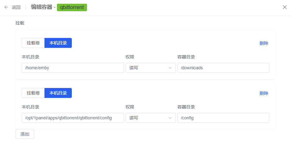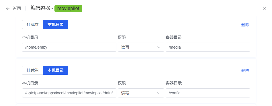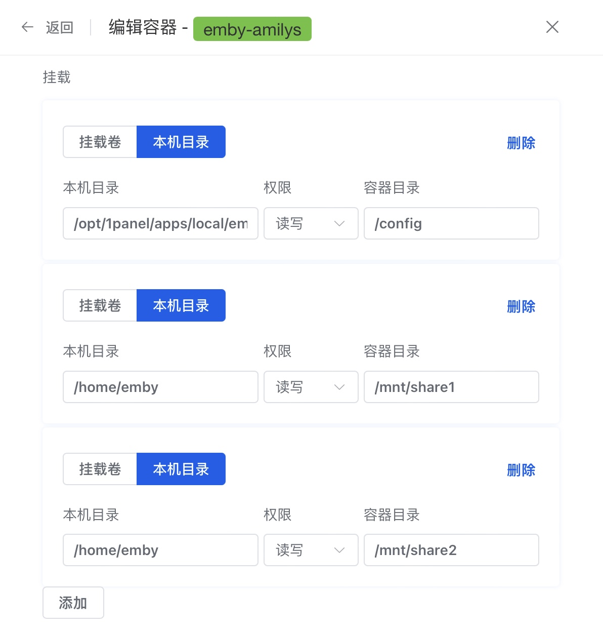 ②进入容器编辑把本机目录挂载到指定目录,比如:/home/emby