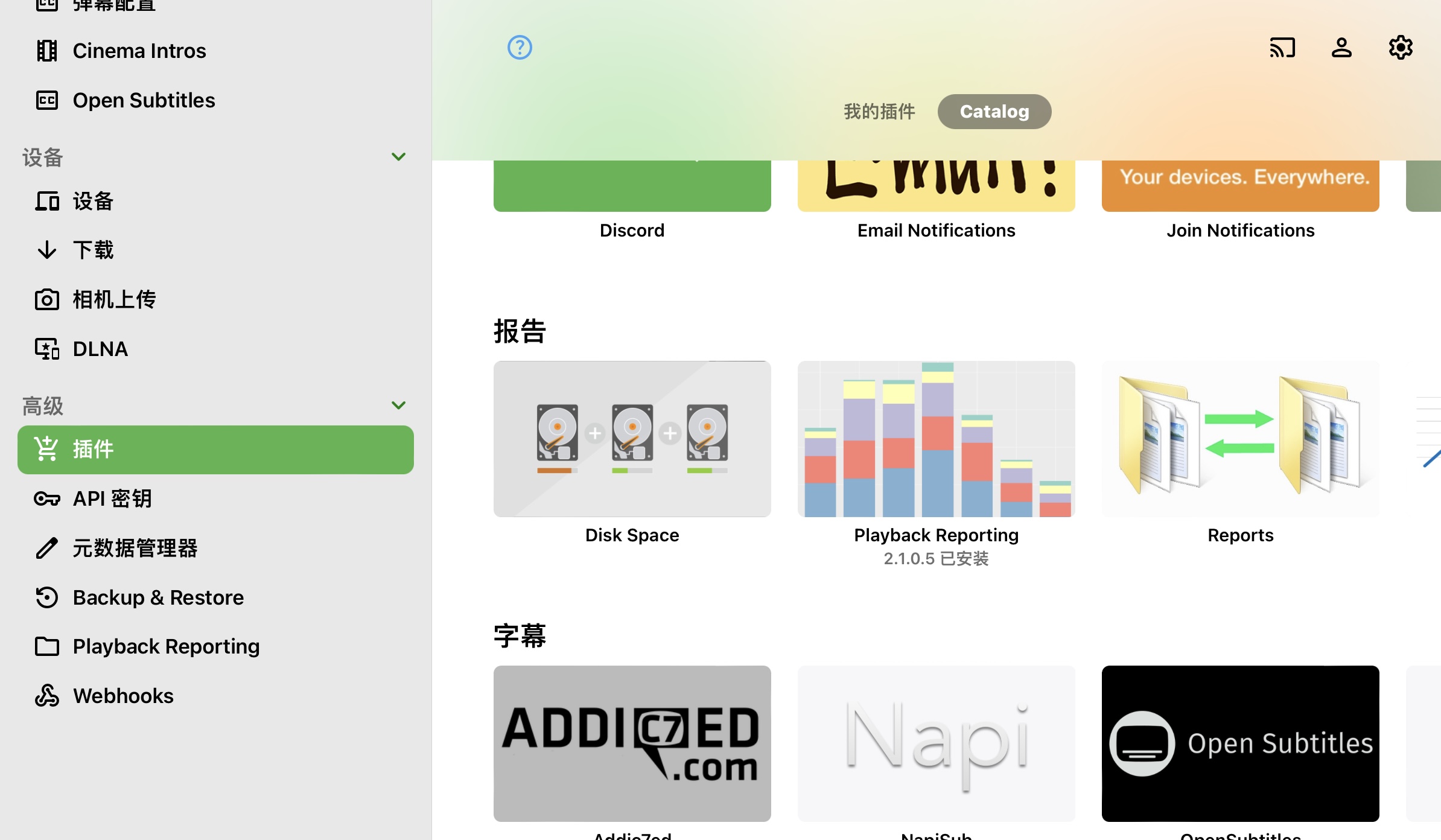 并在插件市场中下载安装playback reporting,如图所示
