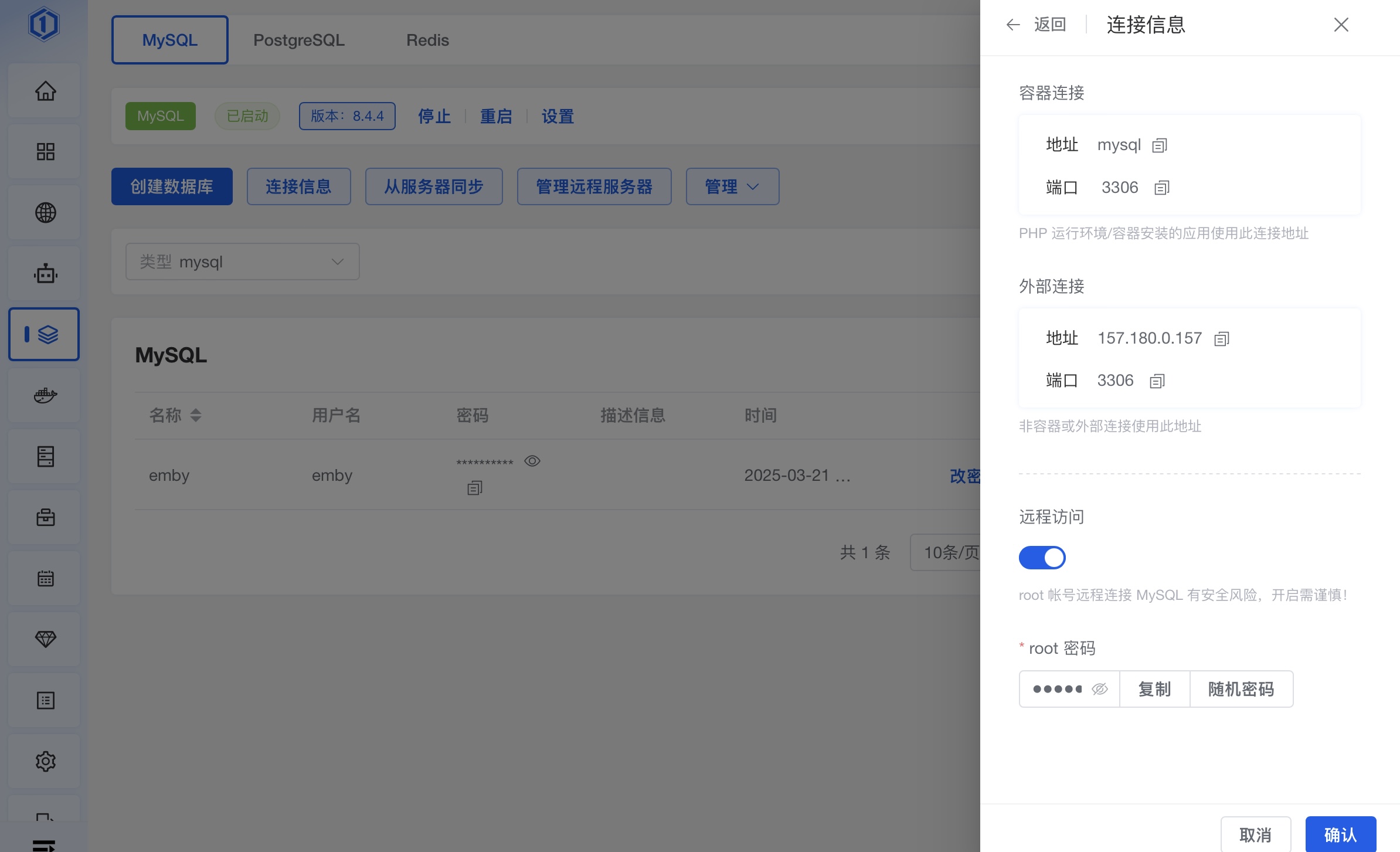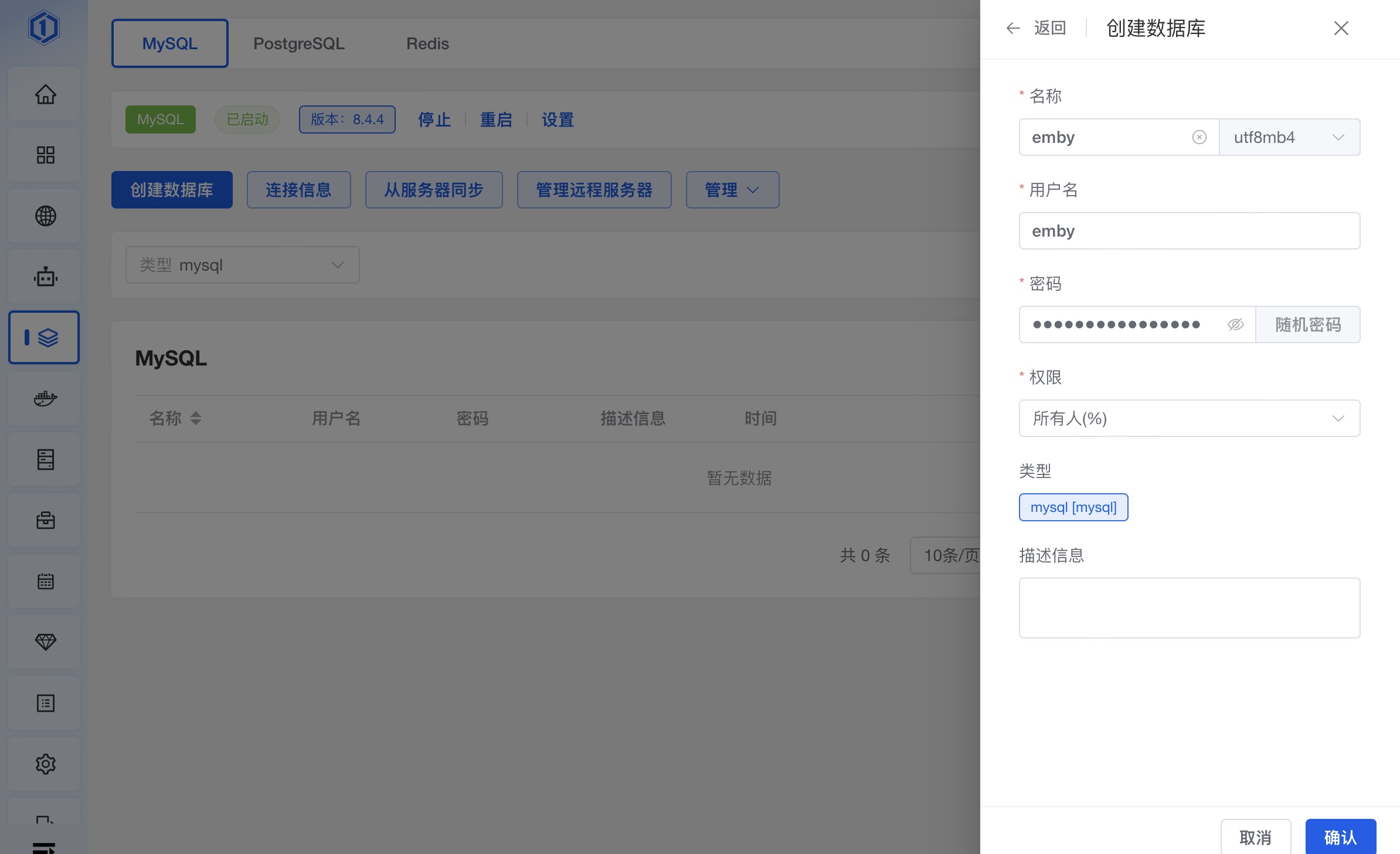 进入面板左侧第五个:数据库。复制刚刚创建的数据库用户名密码,备用