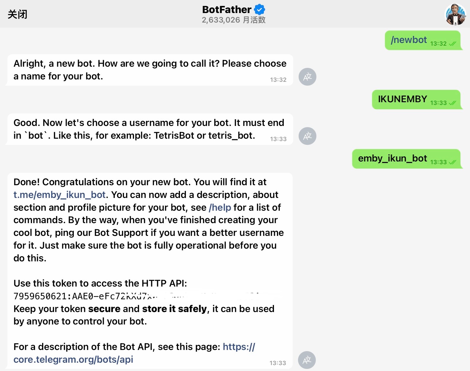 去https://t.me/BotFather 输入/newbot,起一个合适的名字与用户名,复制如图所示Token,备用