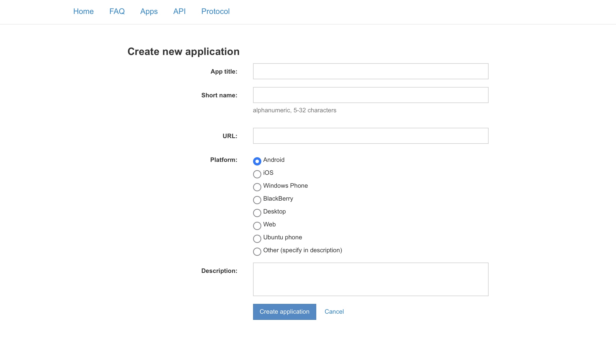 2. 点击 "API development tools" 并填写表格。其中 "App title" 和 "Short name" 可以随意填写,"Platform" 选择你的开发平台,"Description" 是对你的应用的简短描述
